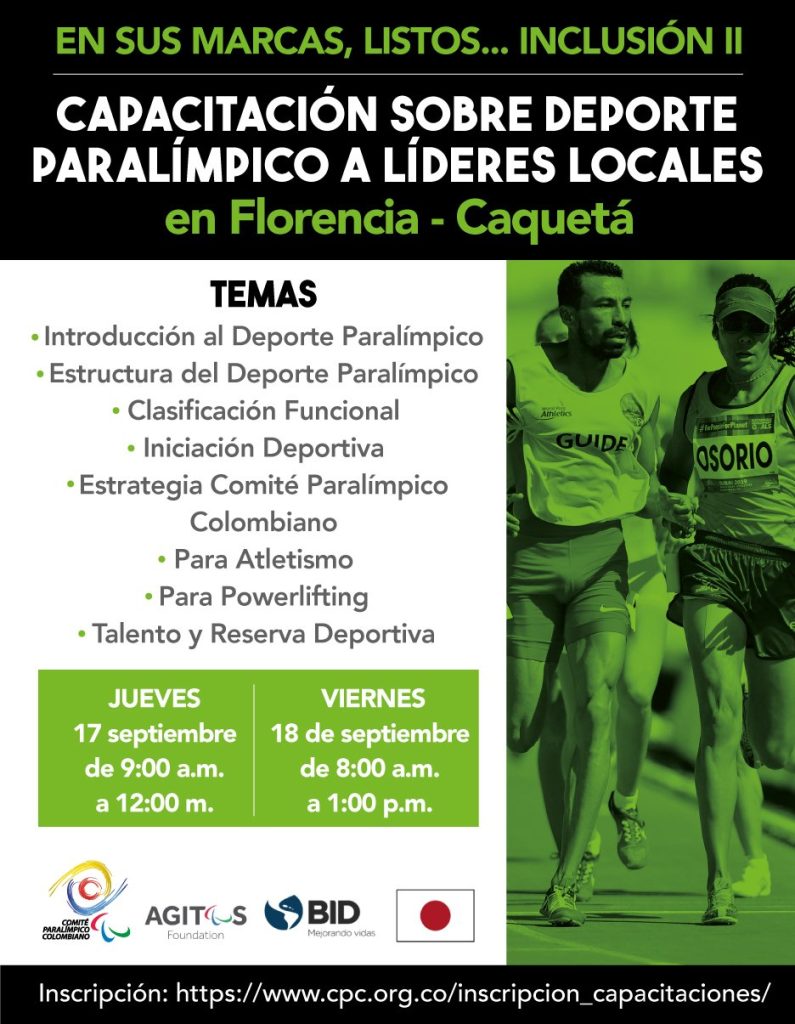 El turno es para que los líderes de Florencia, Caquetá, aprovechen estas capacitaciones el jueves 17 de septiembre de 9:00 a.m. a 12:00 m. y el viernes 18 de septiembre de 8:00 a.m. a 1:00 p.m. Se abordaran temas como la introducción al deporte paralímpico, estructura del mismo, clasificación funcional, Para atletismo, Parapowerlifting, entre otros.